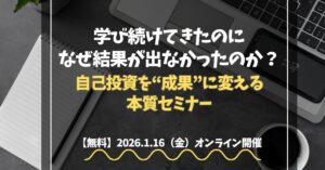 【無料セミナー|1/16開催】自己投資を「成果」に変える唯一の法則。学び続けても結果が出ない理由とは?新着!!